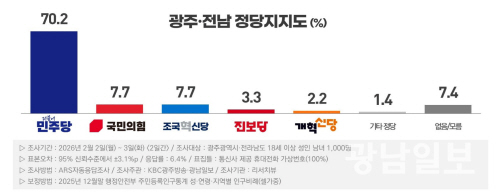 한편, 광남일보와 KBC가 여론조사 전문기관 리서치뷰에 의뢰한 이번 여론조사는 2026년 2월 2일부터 3일까지 이틀간 만 18세 이상 광주·전남 시·도민 1000명을 대상으로 실시됐다. 조사방법은 통신사 제공 가상번호(100%)를 이용한 자동응답(ARS) 방식으로 진행됐다. 표본오차는 95% 신뢰수준에 ±3.1%p, 응답률은 6.4%다. 2025년 12월말 국가 주민등록인구통계에 따라 성·연령·지역별 가중치를 부여해 조사했으며, 자세한 내용은 중앙선거여론조사심의위원회 홈페이지를 참조하면 된다.