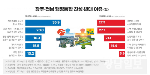 시도민은 행정통합 찬성 이유로 산업·일자리·공공기관 유치 등 지역경제 도움(35.9%)을 최우선으로 답했다. 이어 재정·예산 확보나 국비 지원 등 재원 측면 이점(20.0%), 광역 단위로 행정·정책을 통합해 추진 효율 제고(16.3%), 광역 경쟁력과 대외적 위상이 제고(15.5%), 행정서비스의 표준화·연계 등 주민 편익 제고(10.2%) 순이었다.