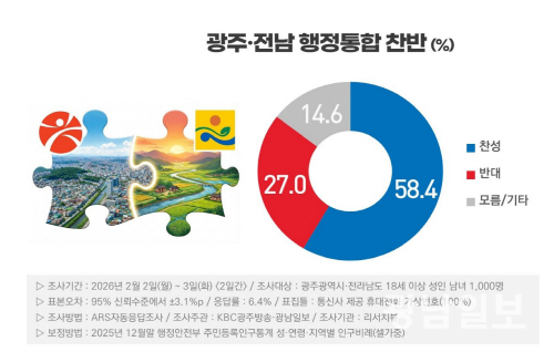 4일 광남일보와 KBC 광주방송이 여론조사 전문기관 리서치뷰에 의뢰해 지난 2~3일 광주·전남 만 18세 이상 시·도민 1000명을 대상으로 실시한 여론조사 결과, 행정통합에 대해서 시도민 58.4%가 찬성하는 것으로 나타났다. 반대는 27.0%였다. 모름이나 기타는 14.6%를 보였다.
