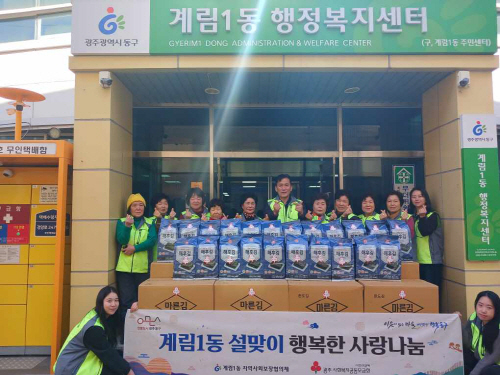 | 광주 동구 계림1동 지역사회보장협의체는 최근 설 명절을 앞두고 돌봄 이웃 200가구에 구운 김 세트(520만원 상당)를 전달했다. |