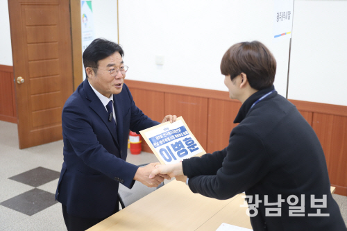 | 이병훈 더불어민주당 호남발전특별위원회 수석부위원장이 4일 광주시선거관리위원회에 제9회 전국동시지방선거 전남광주특별시장 예비후보 등록을 하고 있다. |