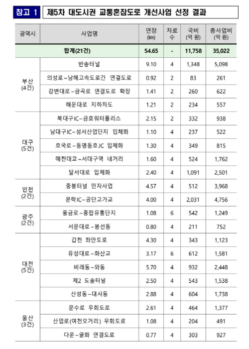 대도시권 교통혼잡도로 개선사업계획은 6대 광역시 간선도로의 혼잡 완화를 위해 5년 단위로 수립하는 계획이다. 이번 5차 계획에는 총 21건(54.7㎞)의 도로 건설 사업이 선정됐다.