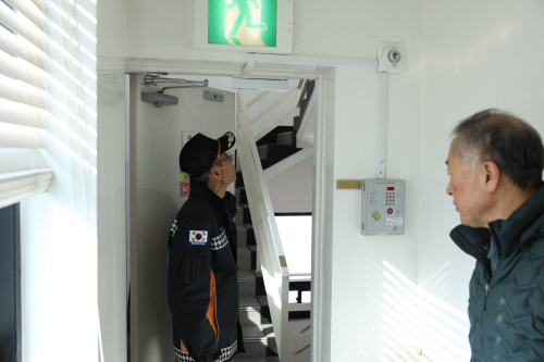 | 김영일 광주 동부소방서장(왼쪽)이 5일 양명요양병원을 찾아 방화문, 소화시설 등을 점검했다. 사진제공=광주 동부소방서 |