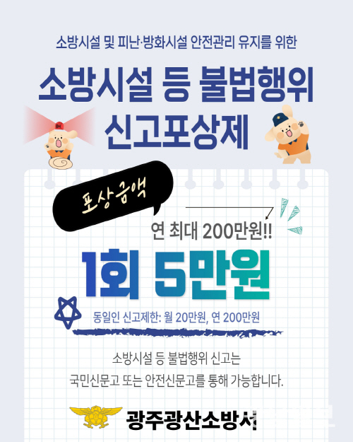 신고는 광주 소방안전본부 홈페이지 내 ‘소방시설 등 불법행위 신고센터’에서 양식을 내려받아 증빙자료(사진 또는 영상)와 함께 관할 소방서에 방문·우편·팩스로 제출하면 된다.