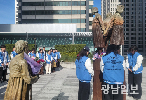 | 샌프란시스코 위안부 기림비에서 학생외교관들이 헌화 및 추모 활동을 진행하고 있다. 사진제공=전남도교육청 |