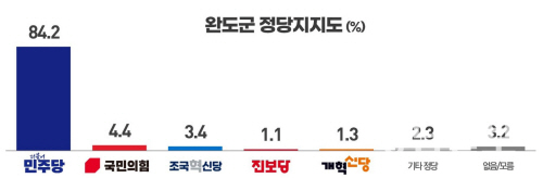 화순과 강진군 정당지지도는 더불어민주당이 각각 83.5%, 78.4%로 독주하고 있는 것으로 나타났으며, 이어 조국혁신당이 각 5.0%, 6.2%로 2위를 기록했다.