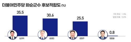 더불어민주당 후보 적합도 조사에서 임지락 전남도의원은 35.5%로 가장 높은 수치를 기록했고, 윤영민 전 화순군의회 부의장은 30.6%, 문행주 전 전남도의원은 25.5%로 뒤를 이었다.