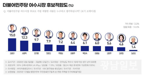 더불어민주당 후보군을 대상으로 한 여수시장 후보 적합도 조사에서는 김영규 전 여수시의회 의장이 15.0%로 가장 높은 수치를 기록했다. 다음으로 서영학 전 행정관이 12.3%, 정기명 현 시장이 9.7%로 뒤를 이었다. 김유화 전 이사장, 주종섭 전 도의원, 이용주 전 의원, 이광일 전 부의장, 김창주 전 회장, 김순봉 전 부의장 등도 한 자릿수 적합도를 기록하며 후보군을 형성했다. ‘없음·모름’ 응답은 14.4%로 나타났다.