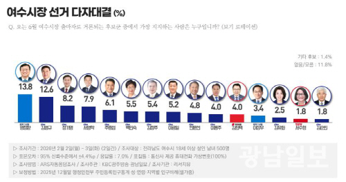 또 이상우 조국혁신당 여수시 지역위원장은 3.4%, 김유화 전 여수시도시관리공단 이사장은 2.5%로 나타났으며, 서수형 진보당 여수시 지역위원장과 김순봉 전 여수시의회 부의장은 각각 1.8%를 기록했다. 기타 후보는 1.4%였다.
