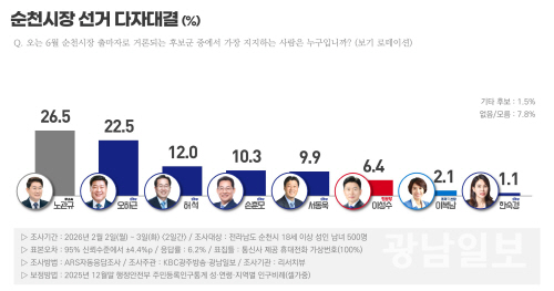 지역 정치권 관계자는 “현재 판세는 초기 인지도와 기존 정치 활동에 따른 결과로 볼 수 있다”며 “본격적인 선거 국면에 접어들면 누가 순천의 현안을 가장 설득력 있게 제시하느냐에 따라 지지율이 달라질 수 있다”고 말했다.