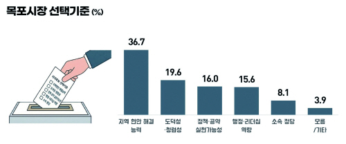 5일 광남일보와 KBC광주방송이 여론조사 전문기관 ‘리서치뷰’에 의뢰해 지난 2~3일 목포시에 거주하는 만 18세 이상 남녀 500명을 대상으로 실시한 여론조사 결과, 목포시장 지지후보를 선택할 때 가장 중점을 두는 기준에 대해 ‘지역 현안 해결 능력’이 36.7%로 가장 높게 나타났다.