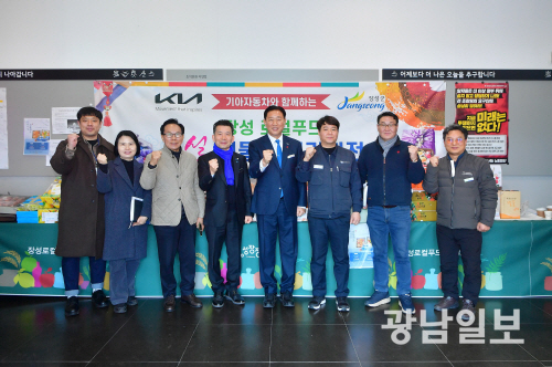 | 지난 4~5일 기아자동차 광주공장에서 열린 농특산물 직거래장터를 찾은 김한종 군수 등이 기념사진을 찍고 있다. |