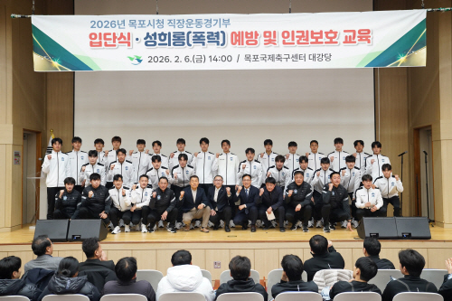 | 목포시는 최근 목포국제축구센터에서 재계약 선수와 신규 영입 선수를 환영하고 올 시즌 선전을 기원하는 ‘목포시청 직장운동경기부’ 입단식을 개최했다. |