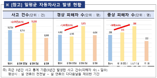 경상 및 중상 피해자 수는 5973명, 386명으로 평상시보다 각각 33.3%, 34.0% 늘었다.