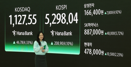 이날 코스피는 전장보다 209.96p(4.13%) 오른 5299.10으로 출발해 208.90p(4.10%) 오른 5298.04에 장을 마쳤다.