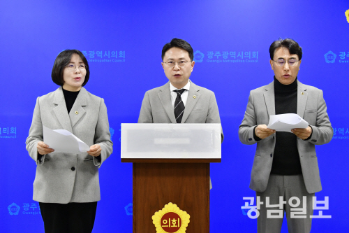 | 박수기·박필순·이귀순 광주시의원은 9일 오전 광주시의회에서 기자회견을 갖고 박수기 의원을 중심으로 한 원팀 구성을 선언하고 있다. |
