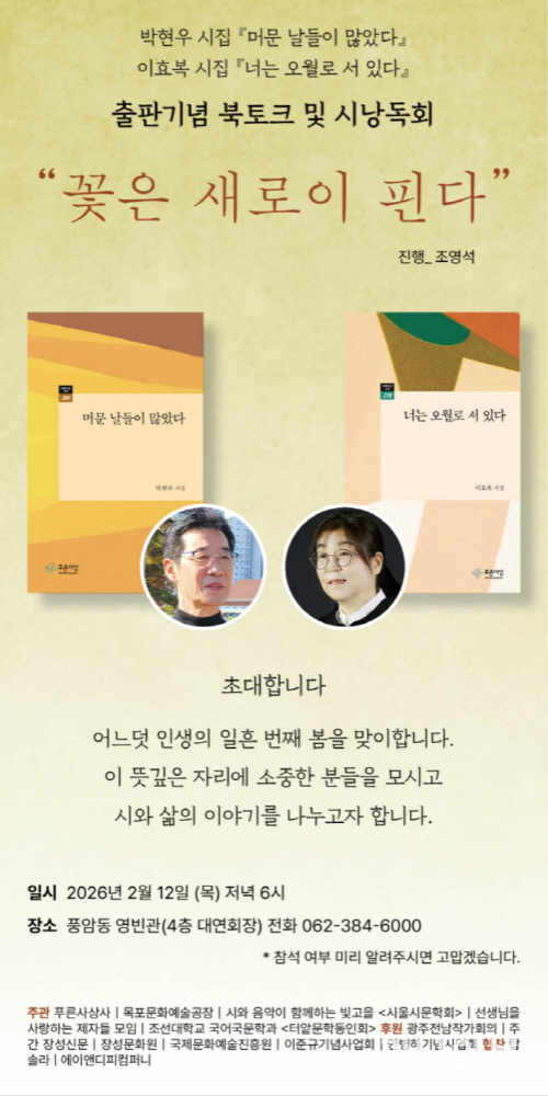 한편 출판기념 북토크 및 시낭독회는 지난 1월 27일 장성에서 한차례 연데 이어 12일 오후 6시 풍암동 영빈관 4층 대연회장에서 열 예정이다. 이날 출판기념 북토크 및 시낭독회에서는 남편인 박현우 시인의 시집 ‘머문 날들이 많았다’와 함께 기념하는 자리가 될 전망이다. 이날 출판기념 북토크 및 시낭독회는 조영석(언론인)씨의 사회로 소프라노 신은선·바리톤 김용원씨의 축하공연, 대담, 손혜진·한종근 시인의 시낭독, 맹문재 교수(안양대)의 ‘박현우·이효복 시세계’ 강연, 민중화가 홍성담씨 등의 축하인사, 피날레 공연 등 다채로운 순서로 진행된다.