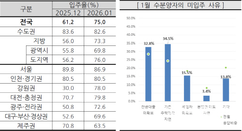 전국적으로도 지난해 1월 전국 아파트 입주율은 75.0%로 전월 대비 13.8%p 상승했다.