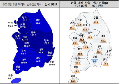 주택산업연구원이 10일 발표한 ‘2월 아파트 입주전망지수’에 따르면 광주 입주전망지수는 100.0으로 전월보다 23.6p 상승했다. 전남 역시 90.9로 같은 기간 13.2p가 올라 입주 여건 개선 기대가 반영됐다.