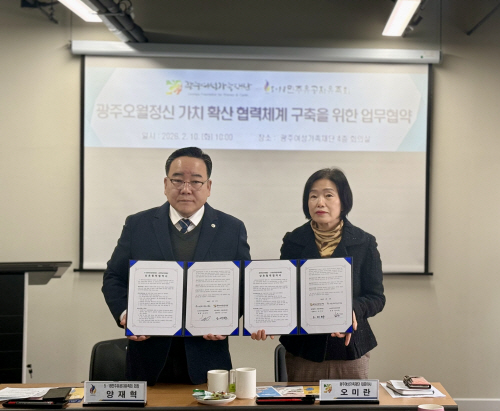 | 광주여성가족재단과 5·18민주유공자유족회가 10일 오전 재단 회의실에서 ‘광주오월정신 가치 확산 협력체계 구축을 위한 업무협약’을 체결했다. |