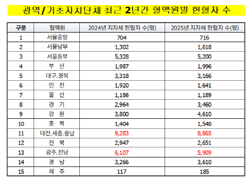 2024년 지자체 헌혈자 수는 대전·세종·충남이 9283명으로 가장 많았고, 광주·전남 6107명, 서울 동부 5328명, 강원 3800명, 경남 3266명, 경기 2964명 순이었다.
