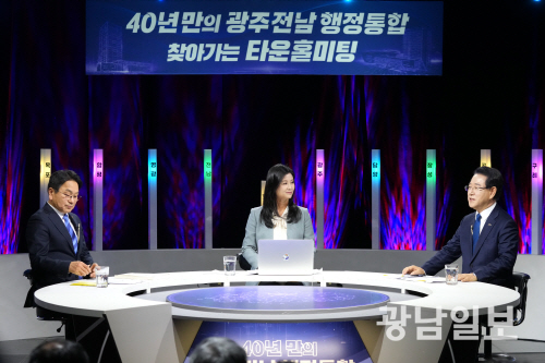 10일 오후 광주MBC 공개홀에서 열린 ‘광주·전남 행정통합 찾아가는 타운홀미팅’에 참석한 강기정 광주시장과 김영록 전남도지사는 광주 근교 시·군 주민 100여명과 만나 행정통합에 대한 의견을 나누며 최근 쟁점이 된 정부 부처의 특례 불수용 등 지역민의 궁금증을 해소하는 시간을 가졌다.