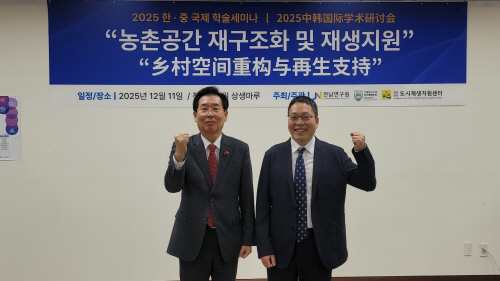 | 김영선 전남연구원장이 연구원 상생마루에서 열린 한·중 국제 학술세미나에서 스웨이 중국농업대학 경제관리학원장과 기념촬영을 하고 있다. |