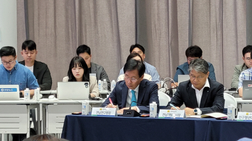 | 김영선 전남연구원장이 JB금융그룹 아우름캠퍼스에서 열린 ‘제12회 호남권 정책협의회’에 참석, 호남권 메가시티 경제동맹 선언 관련 회의를 청취하고 있다. |