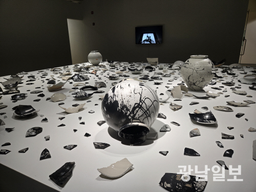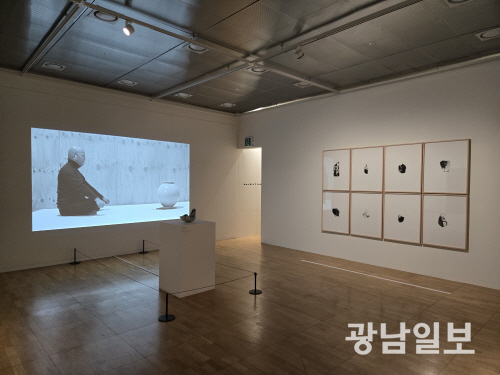 박치호 작가가 신체의 파편을 통해 인간의 상흔을 드러낸다면, 정광희 작가는 수묵을 바탕으로 달항아리와 먹이라는 전통 매체를 활용해 사유를 시도한다.