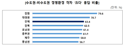 조사 결과, 수도권 중소기업은 수도권과 비수도권 간 경영환경 격차에 대해 ‘보통이다’라고 응답한 비율이 48.3%였다. 반면 비수도권 중소기업은 ‘격차가 크다’는 응답이 63.4%에 달해 수도권과 비수도권 간 체감 인식에서 뚜렷한 차이를 보였다.