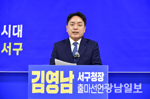 | 김영남 더불어민주당 광주시당 상임부위원장이 11일 광주시의회 브리핑룸에서 기자회견을 갖고 광주 서구청장 출마를 공식 선언하고 있다. |