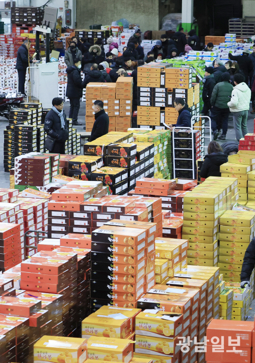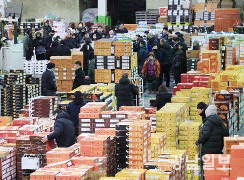 | 북적이는 농산물공판장 민족대명절인 설을 앞두고 11일 광주 북구 각화동 농산물공판장에는 사과, 배 등 제수용품과 선물을 구입하려는 시민들로 북적이고 있다. 최기남 기자 bluesky@gwangnam.co.kr |