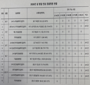 설 연휴 기간 응급진료를 운영하는 동물병원 정보는 120콜센터(062-120)와 광주시 누리집(https://www.gwangju.go.kr), 농림축산식품부 누리집(https://www.mafra.go.kr)에서 확인할 수 있다.