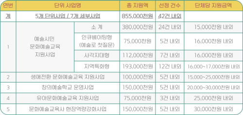 공모 대상은 예술시민 문화예술교육지원사업. 창의예술학교 운영사업, 생애전환 문화예술교육지원사업, 유아 문화예술교육지원사업, 문화예술교육사 현장 역량 강화사업 5개 사업으로, 총 8억 5500만원 규모이며 42건 내외를 선정해 지원할 예정이다.