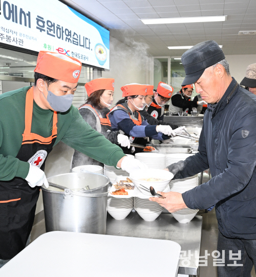 | ‘떡국 드시고 힘내세요’ 12일 오전 광주 북구 임동 대한적십자사 광주전남지사 광주봉사관 적십자 무료급식소에서 한국도로공사 광주전남본부 직원들과 봉사원들이 어르신들에게 떡국을 배식하고 있다. 최기남 기자 bluesky@gwangnam.co.kr |