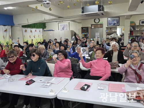 행사는 치매예방 체조로 시작됐다. 음악에 맞춰 천천히 팔과 다리를 움직이던 어르신들의 표정에는 어느새 미소가 번졌다. 이어진 전통공예 체험 시간에는 자개 스티커를 이용한 거울 꾸미기가 진행됐다. 어르신들은 강사의 설명을 유심히 듣고 스티커 하나하나를 조심스럽게 붙이며 자신만의 거울을 완성해 나갔다.