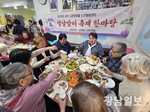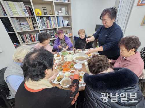 프로그램이 끝난 뒤 어르신들은 2층 식당으로 자리를 옮겼다. 김치와 깍두기, 수육곰탕, 고사리무침, 기정떡 등이 차려진 식탁에서는 서로 음식을 권하며 안부를 묻는 정다운 모습이 이어졌다. 식당 안에는 명절 특유의 푸근한 분위기가 감돌았다.