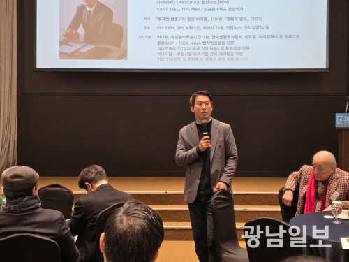 | 광주경영자총협회는 13일 광주 서구 홀리데이인광주호텔 3층 컨벤션홀에서 제1712회 금요조찬포럼을 개최했다. 사진은 류재언 변호사가 ‘성공하는 리더를 위한 협상 전략’이란 주제로 강연을 하는 모습. |
