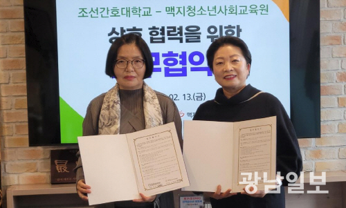 | 조선간호대학교 박명희(왼쪽) 총장과 맥지청소년사회교육원 이미경 원장이 업무협약을 체결한 뒤 기념촬영을 하고 있다. |