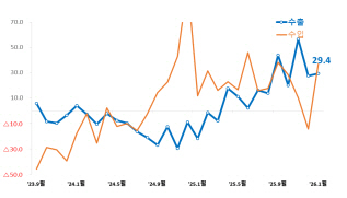 국가별 수출은 주요 교역국인 미국(-8.3%)은 2개월 만에 감소 전환했으며, 중국(30.0%)은 6개월 연속 증가했다. 중남미(65.3%), 동남아(56.9%), 유럽연합(39.3%) 등도 늘었다.