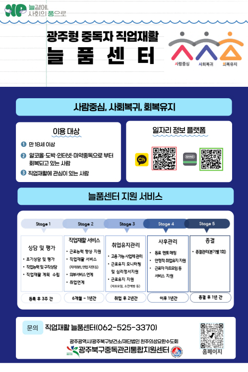 광주시는 중독자 직업재활 전담기관인 ‘늘품센터’에 위탁, 지원사업을 운영하고 있다. 18세 이상 중독 회복자 가운데 직업재활 욕구가 있거나 유관기관이 의뢰한 대상자가 지원사업을 이용할 수 있다.