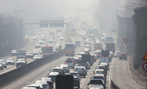 | 설 연휴 첫날인 14일 경부고속도로 서울 잠언 IC 인근이 서울을 빠져나가는 하행선 차량(오른편)으로 붐비고 있다. 연합뉴스 |