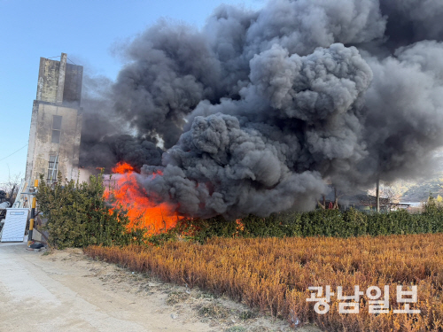 | 17일 오전 9시53분 순천시 서면 지본리 한 자재창고에서 화재가 발생했다. 사진제공=순천소방서 |