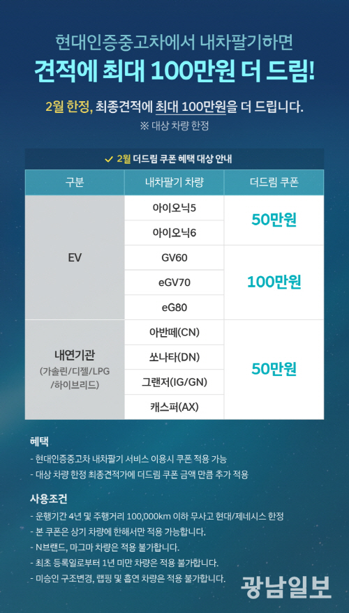 더드림 쿠폰은 현대인증중고차에서 ‘내차팔기’ 서비스 이용 시 사용 가능하며 적용 가능한 차종은 매달 변경될 예정으로 현대인증중고차 홈페이지에서 확인할 수 있다.