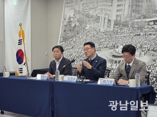 | 5·18기념재단은 19일 오후 2시 재단 2층 오월기억저장소에서 5·18 역사왜곡 법률대응 현황 및 성과 발표 기자 간담회를 개최했다. 사진은 김정호 변호사(가운데)가 ‘역사의 아이러니 전두환 회고록’라는 주제로 발표를 하는 모습. |