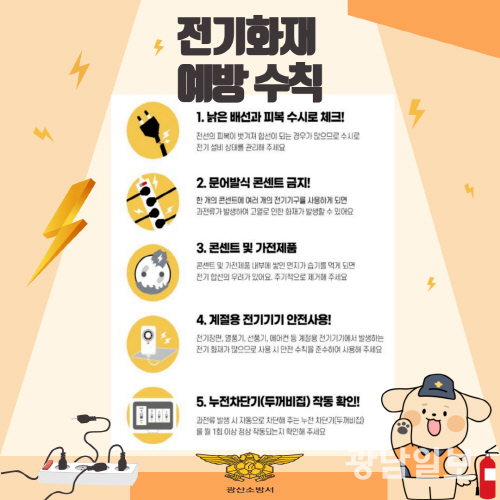 이에 전기 화재 예방을 위해 전기 제품의 올바른 관리법으로 △안전인증(KC마크) 받은 제품 사용 △외출 시 플러그 뽑기 △전선 피복 상태 수시 확인 △기기 주변 가연성 물질 제거 △문어발식 콘센트 사용 금지 △전기장판은 이불 등 겹겹이 덮은 채 사용 금지 등을 안내했다.