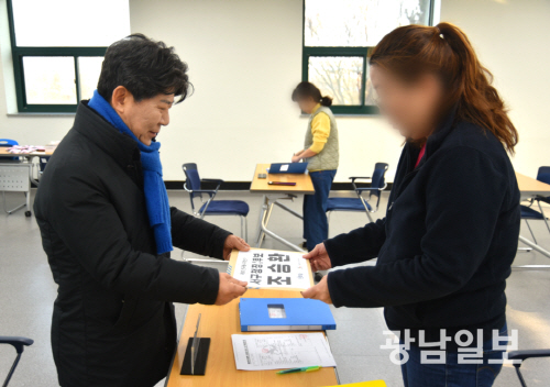 | 조승환 더불어민주당 정책위 부의장이 20일 서구 선거관리위원회를 찾아 서구청장 예비후보 등록서류를 제출하고 있다. |