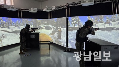 | 22일 강진 과학화 예비군훈련장의 가상현실(VR) 영상모의사격장에서 장병들이 사격 시범을 보이고 있다. |