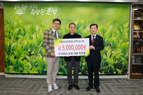 | ㈜보림이 최근 지역 인재 양성을 위한 장학금 500만원을 (재)보성군장학재단에 기탁했다.(왼쪽부터 김철우 보성군수, 박광열 ㈜보림 대표, 문찬오 보성군장학재단 이사장) |