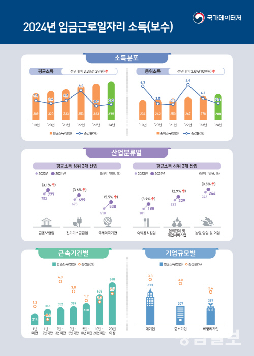 23일 국가데이터처가 발표한 ‘2024년 임금근로 일자리 소득(보수) 결과’에 따르면 2024년 12월 임금근로 일자리에서 일한 근로자의 평균소득은 375만원으로 전년 대비 12만원(3.3%) 증가했다.